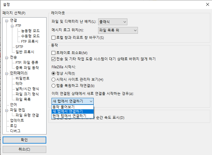 파일질라 설정 창 편집 > 설정 > 인터페이스 > 동작 구역에서 '이미 연결된 상태에서 새로 연결을 시작하는 경우(a) : '